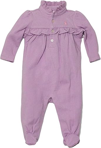 An adorable long-sleeved coverall in breathable cotton mesh. 100% cotton. Machine washable. Imported. Embroidered pony at the left chest. Ring snaps down the leg openings for easy on and off. Ruffled stand collar, four-button placket. Order now and Get 16% off Ralph Lauren Layette Girl’s Ruffle Collar Coverall